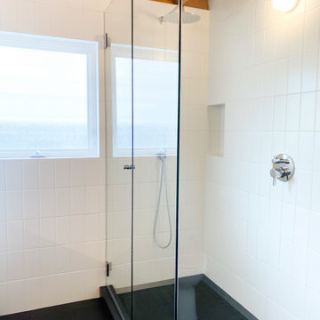 Walk-in shower - country white tile and subway tile medium tone wood floor and brown floor walk-in shower idea in Columbus with shaker cabinets, white cabinets, a two-piece toilet, white walls, an undermount sink, a hinged shower door and black countertops